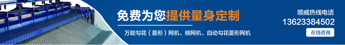 | 安平縣順威絲網(wǎng)機(jī)械設(shè)備制造有限公司自產(chǎn)自銷,省去中間環(huán)節(jié),讓利給客戶,真正的讓您省錢。主要產(chǎn)品有:萬(wàn)能勾花(菱形)網(wǎng)機(jī)、縮網(wǎng)機(jī)、自動(dòng)勾花菱形網(wǎng)機(jī)、全自動(dòng)勾花菱形網(wǎng)機(jī)。 |